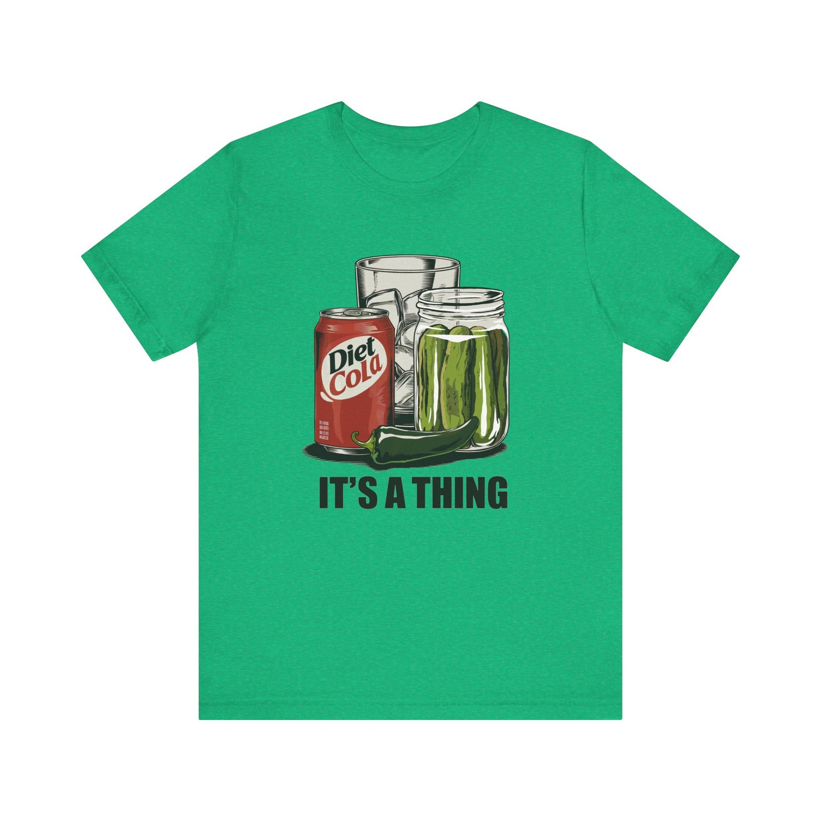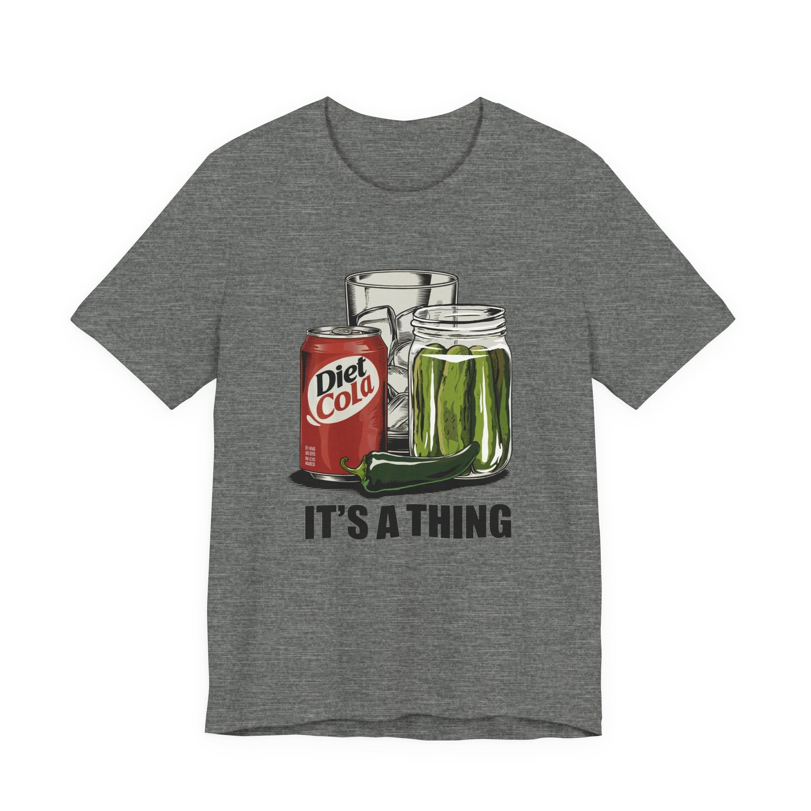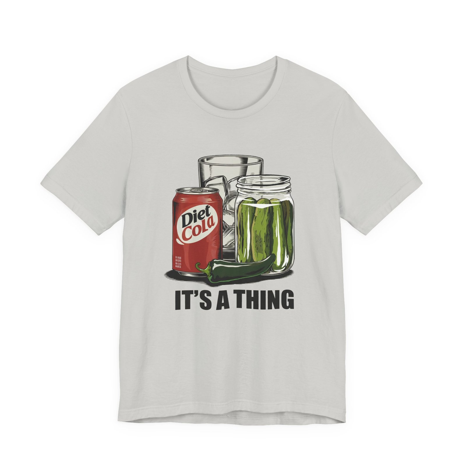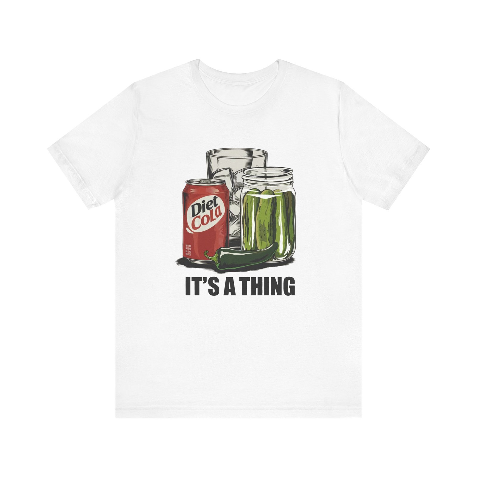 A fun and quirky t-shirt featuring a jar of pickles, a jalapeño pepper, and a can of Diet Coke, inspired by the viral drink trend created by Dua Lipa. This tee exudes a trendy and playful vibe, perfect for casual outings and social gatherings. Ideal for fans of Dua Lipa and those looking to stay on top of pop culture trends. Great for gifting on birthdays, holidays, or just for a fun surprise.