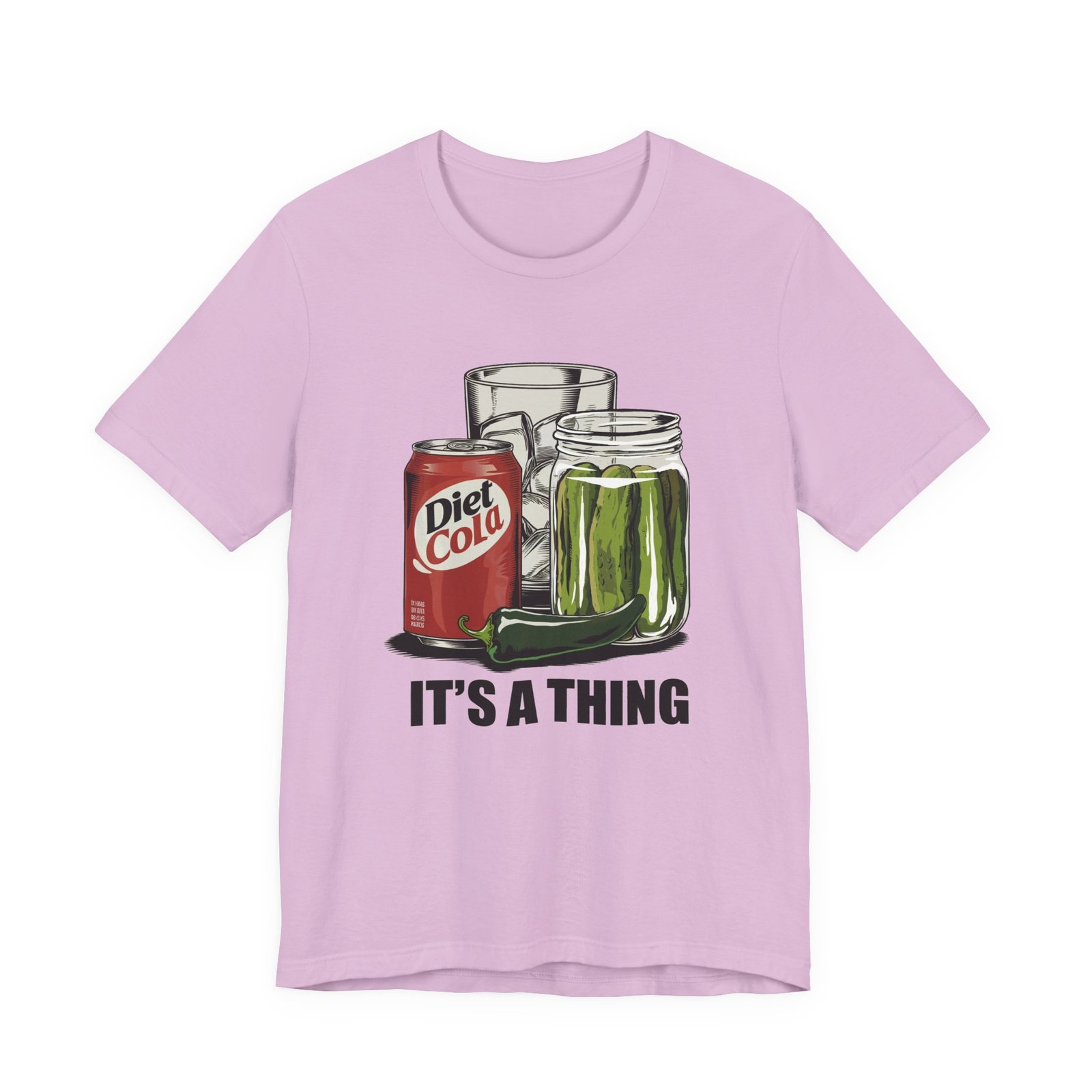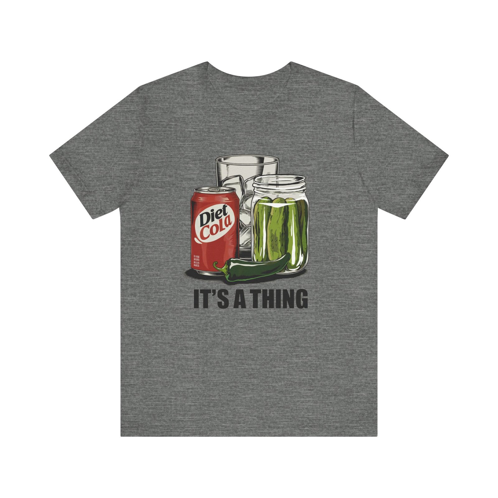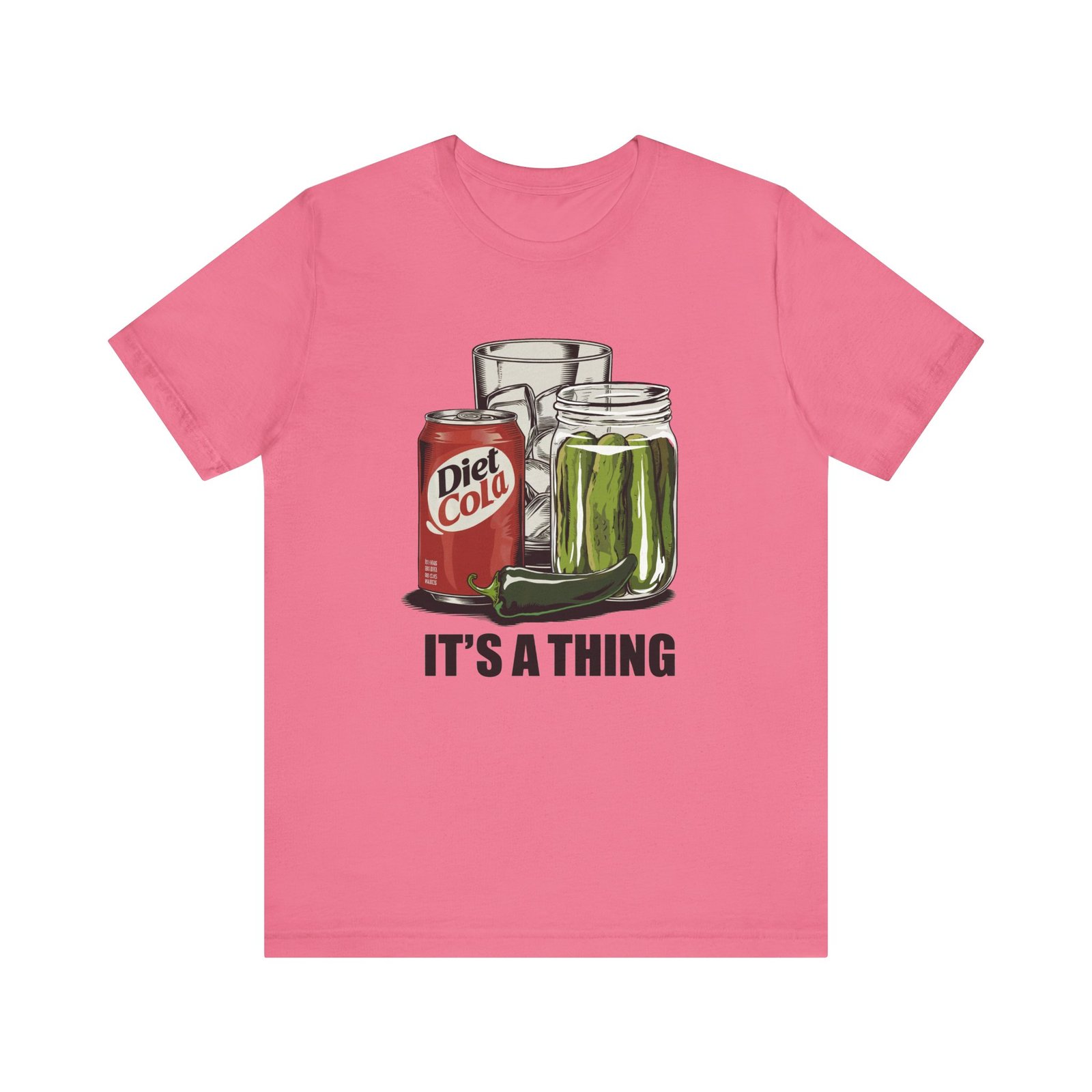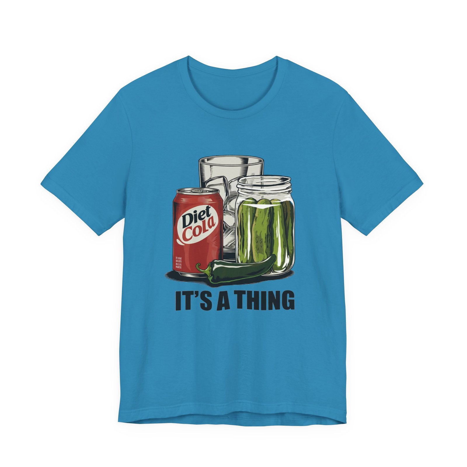 A fun and quirky t-shirt featuring a jar of pickles, a jalapeño pepper, and a can of Diet Coke, inspired by the viral drink trend created by Dua Lipa. This tee exudes a trendy and playful vibe, perfect for casual outings and social gatherings. Ideal for fans of Dua Lipa and those looking to stay on top of pop culture trends. Great for gifting on birthdays, holidays, or just for a fun surprise.