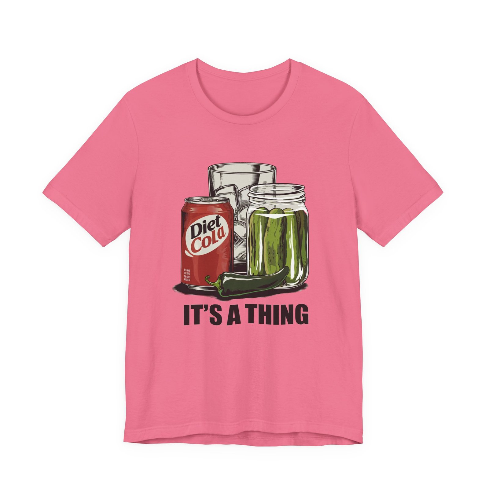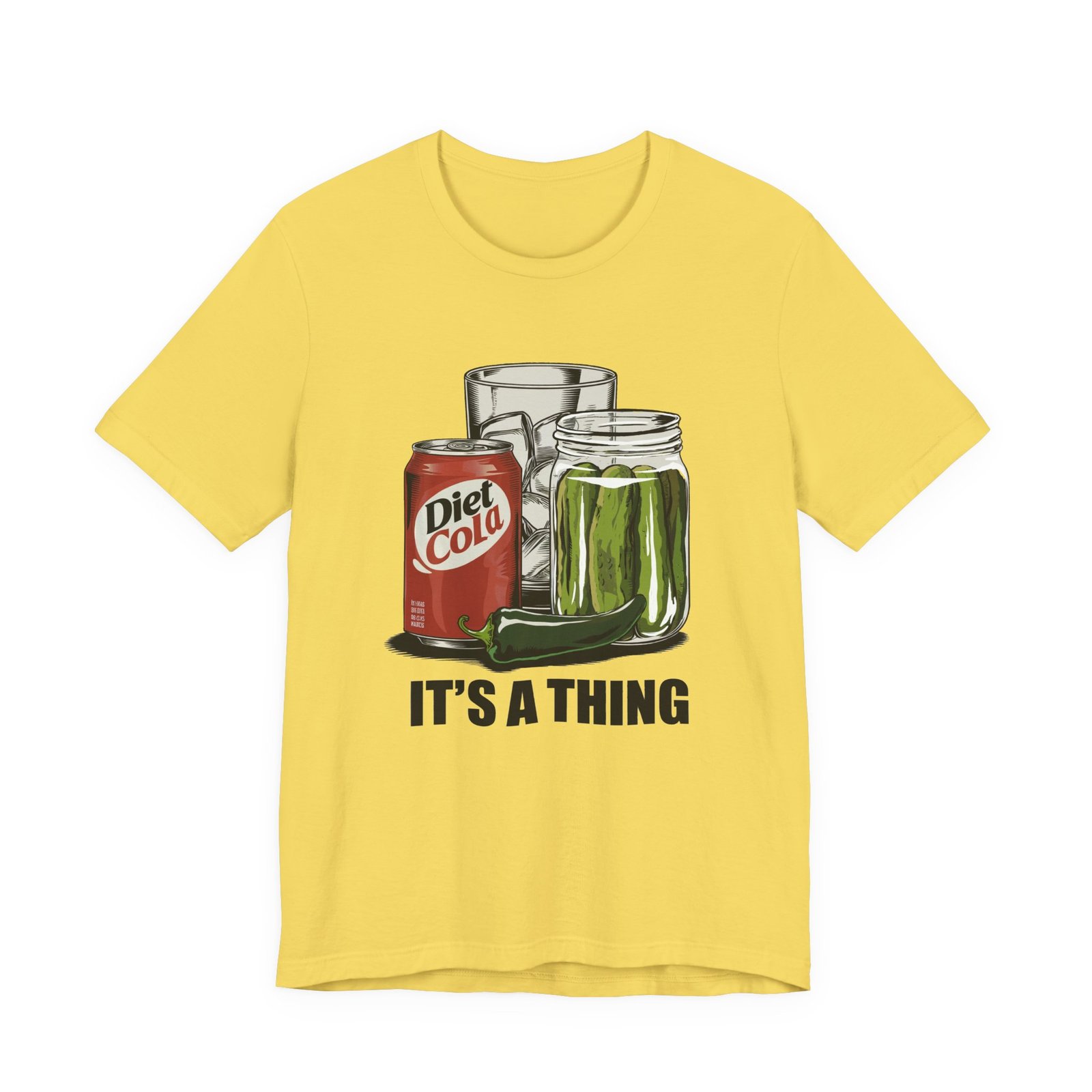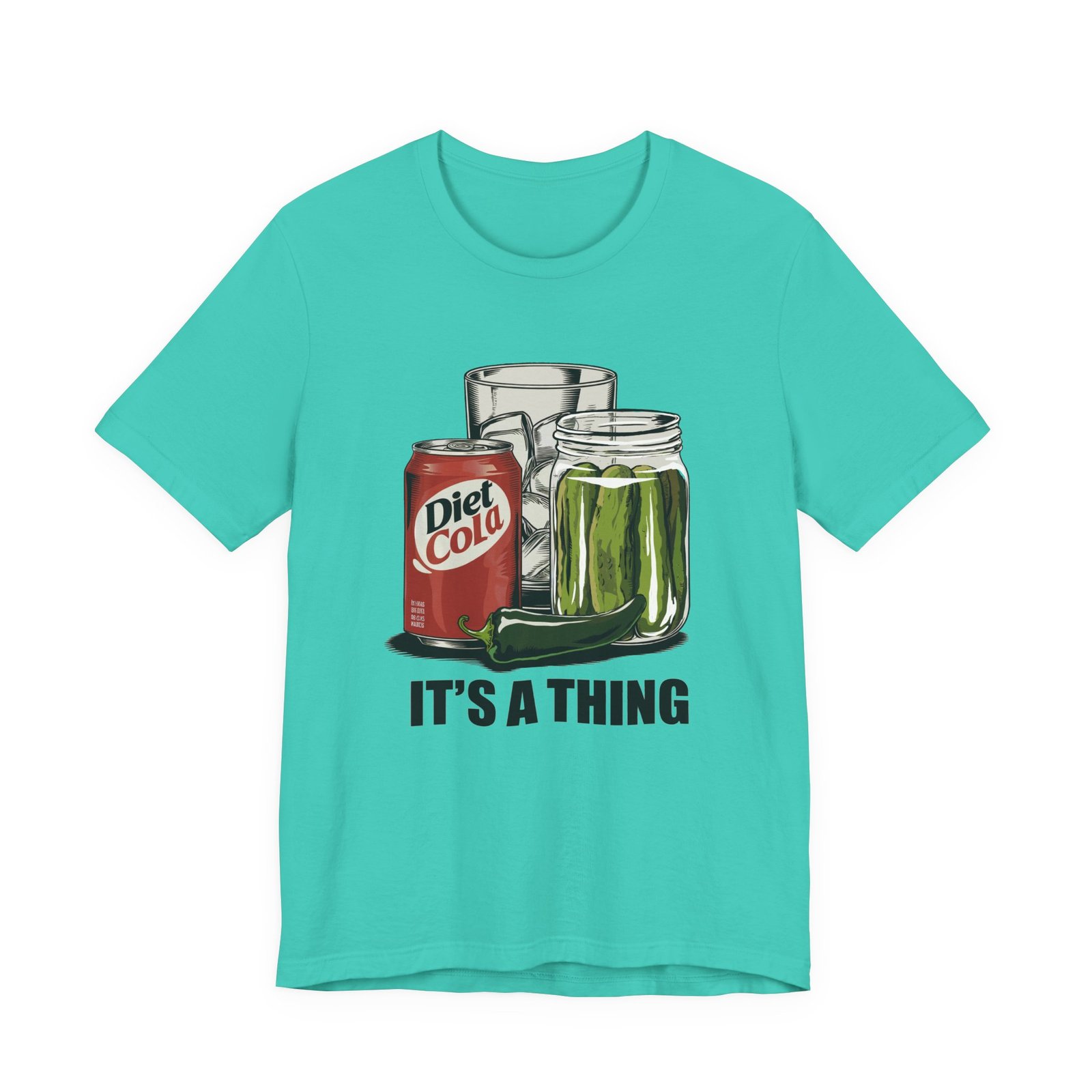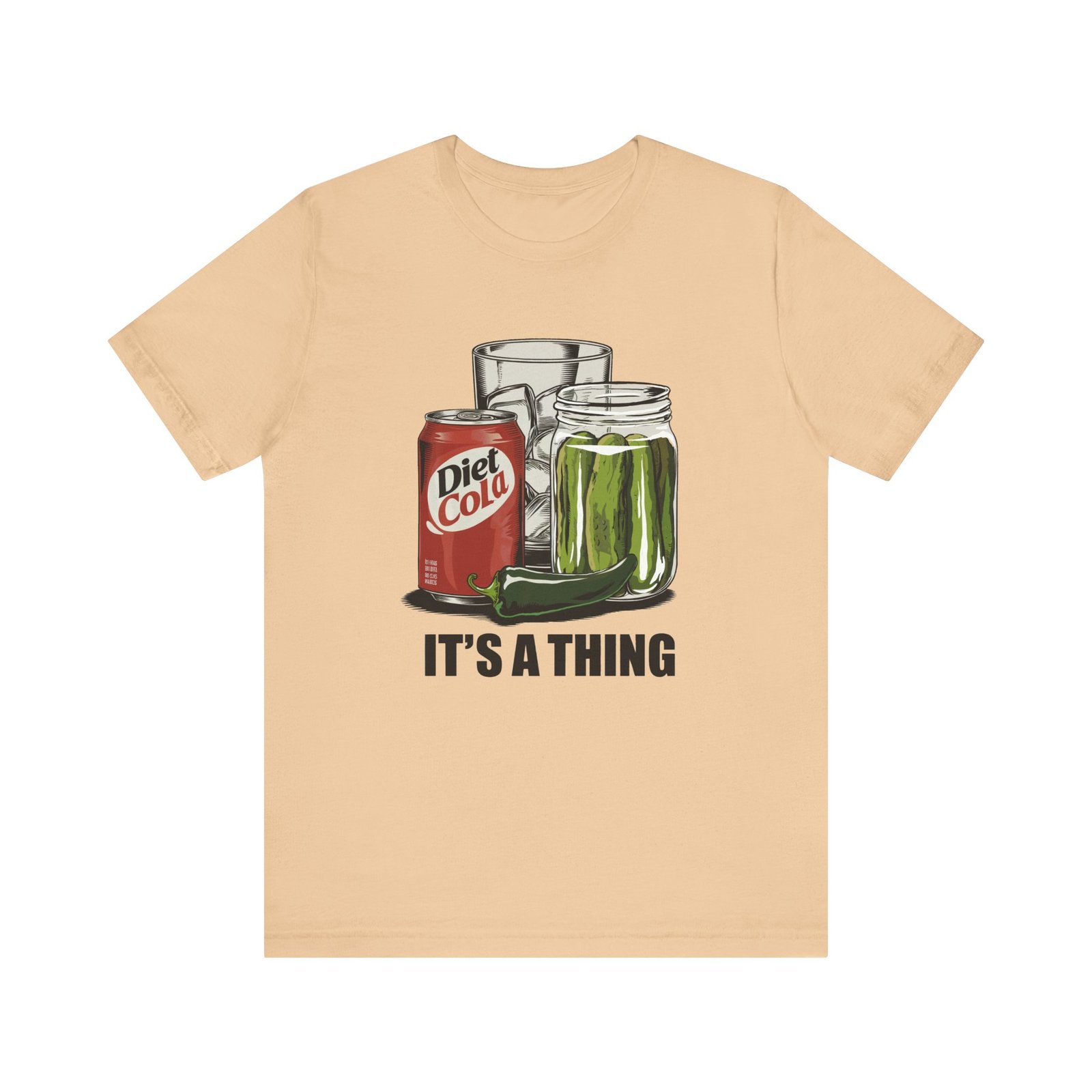 A fun and quirky t-shirt featuring a jar of pickles, a jalapeño pepper, and a can of Diet Coke, inspired by the viral drink trend created by Dua Lipa. This tee exudes a trendy and playful vibe, perfect for casual outings and social gatherings. Ideal for fans of Dua Lipa and those looking to stay on top of pop culture trends. Great for gifting on birthdays, holidays, or just for a fun surprise.