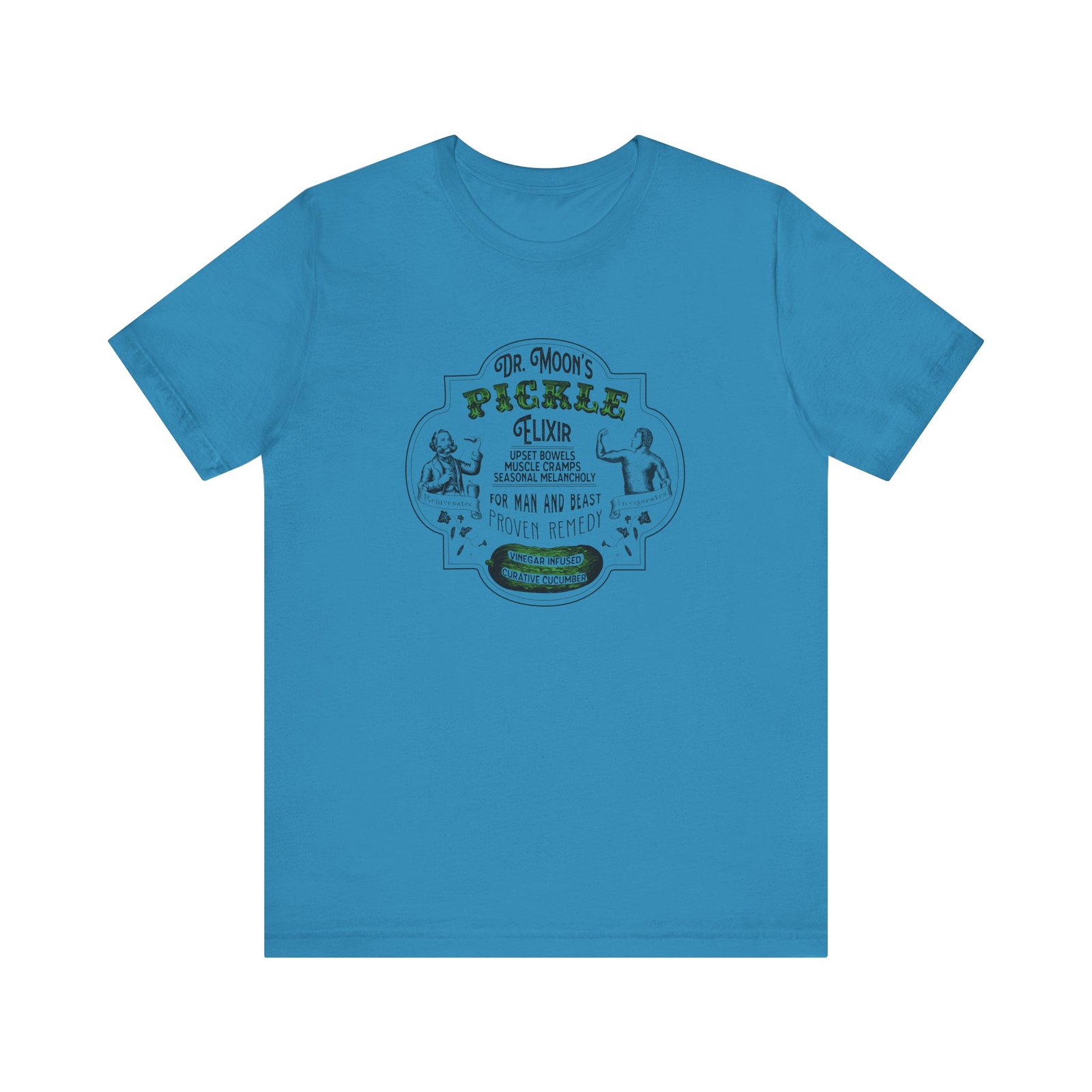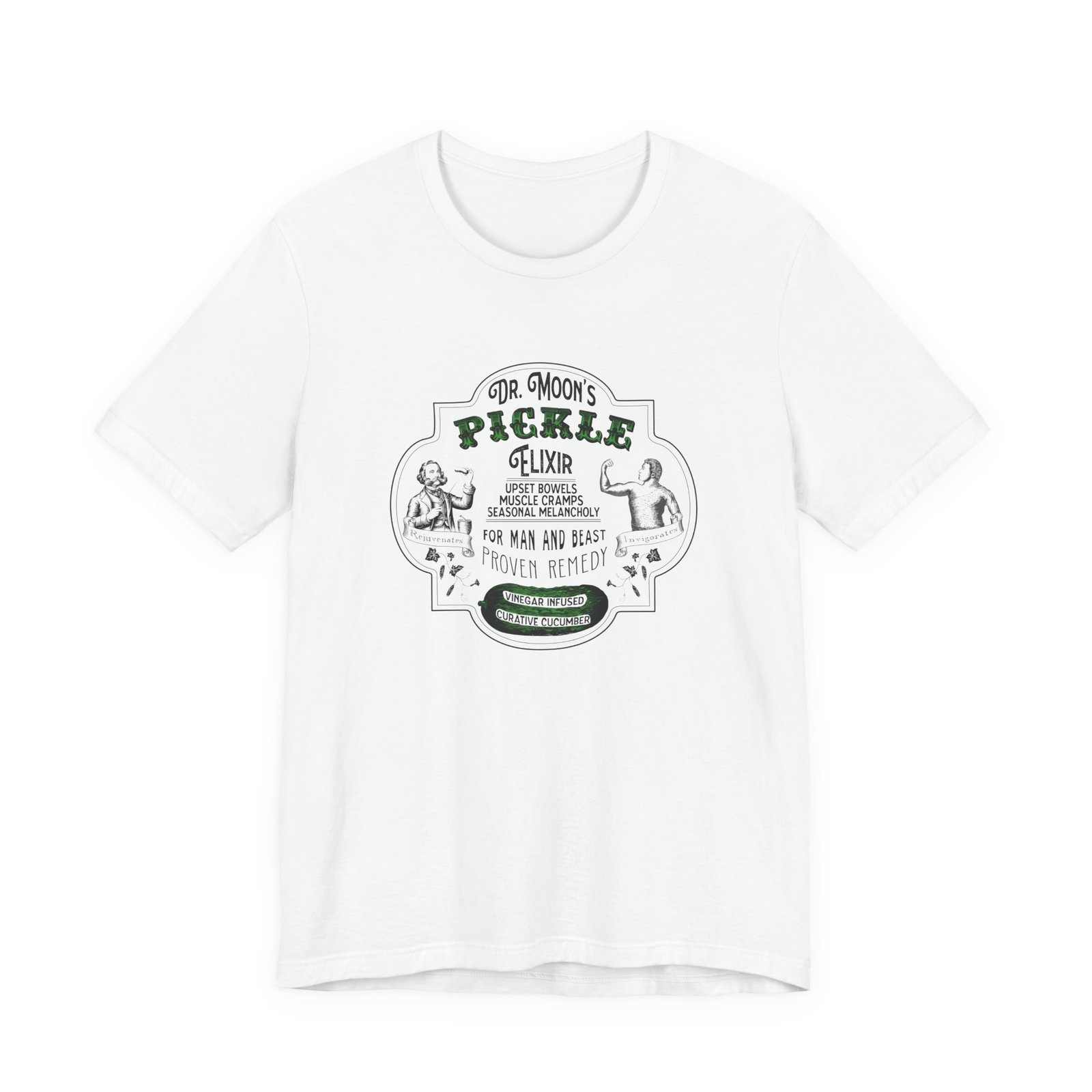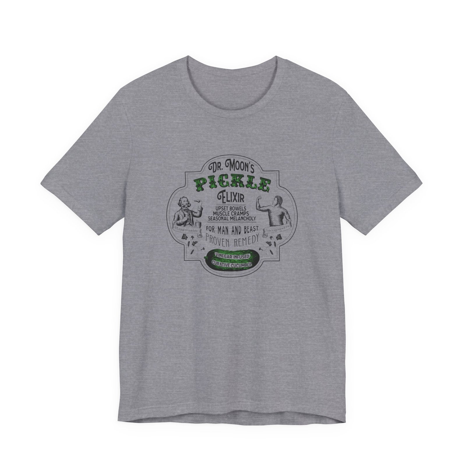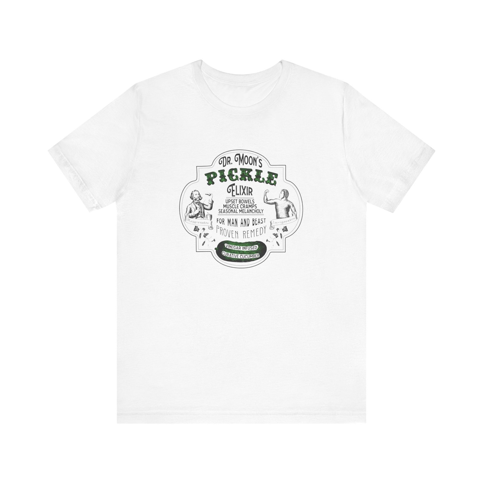 A shoutout to the snake oil peddlers of yesteryear. A funny pickle elixir shirt advertising the very real benefits of pickle juice to both beast and man!