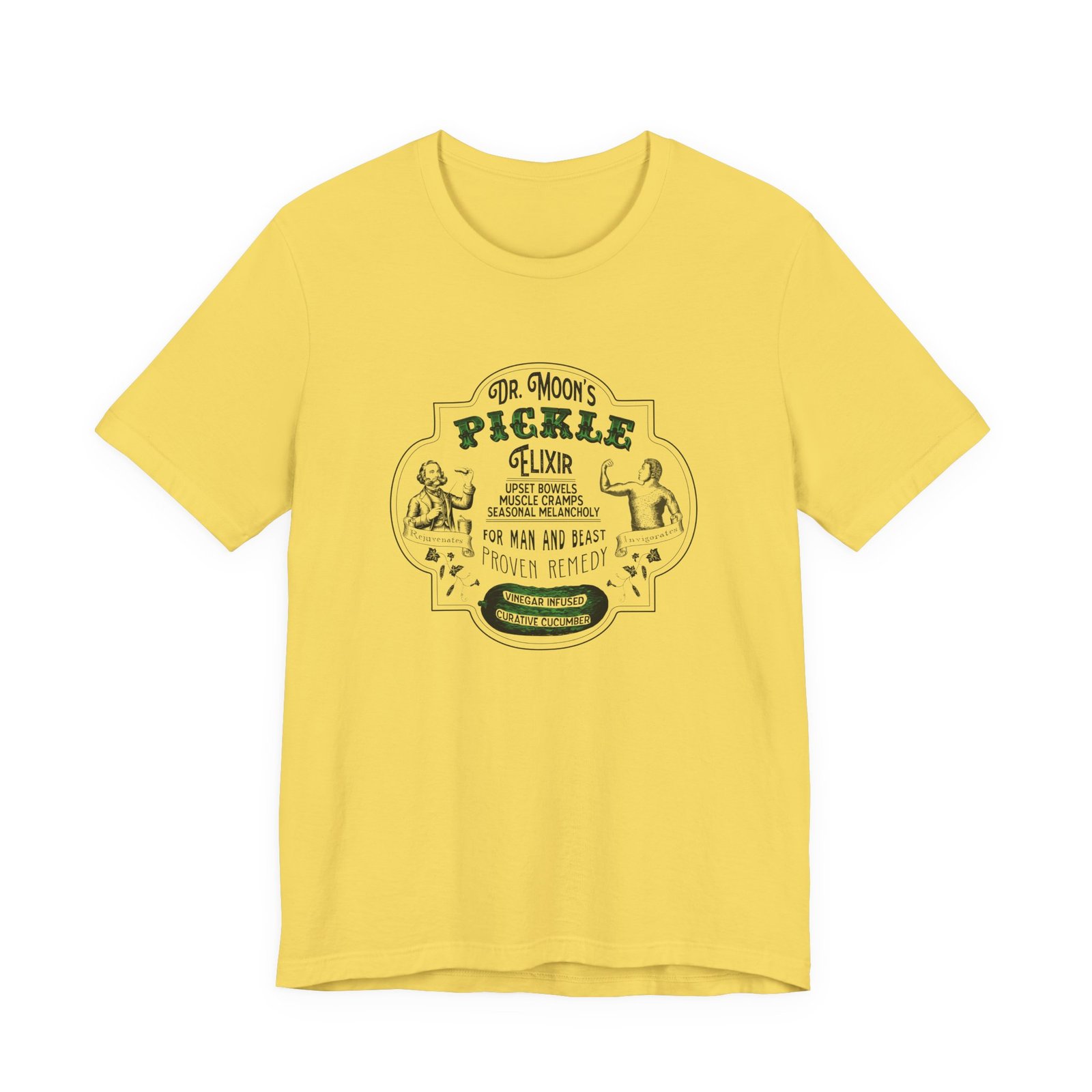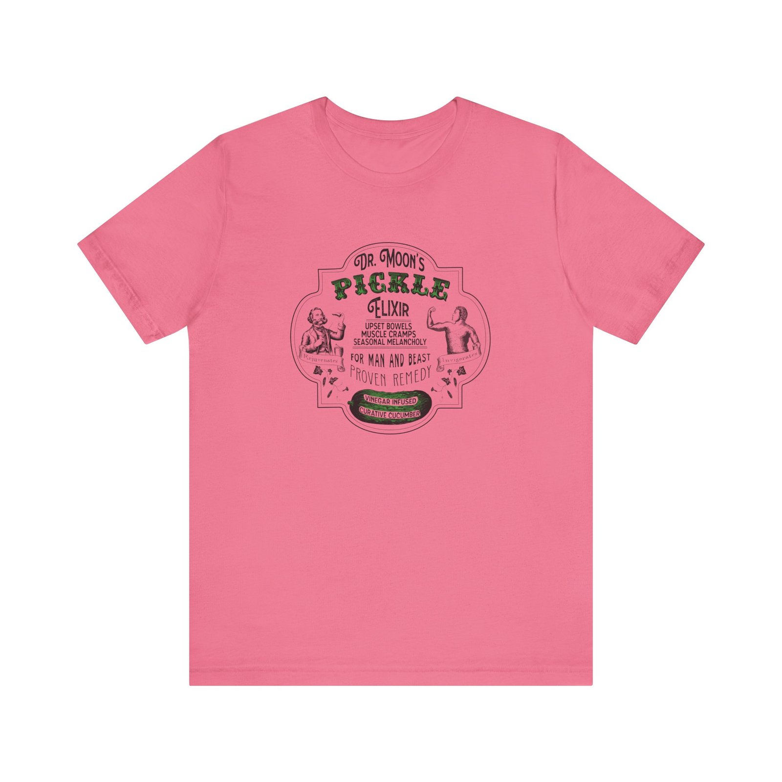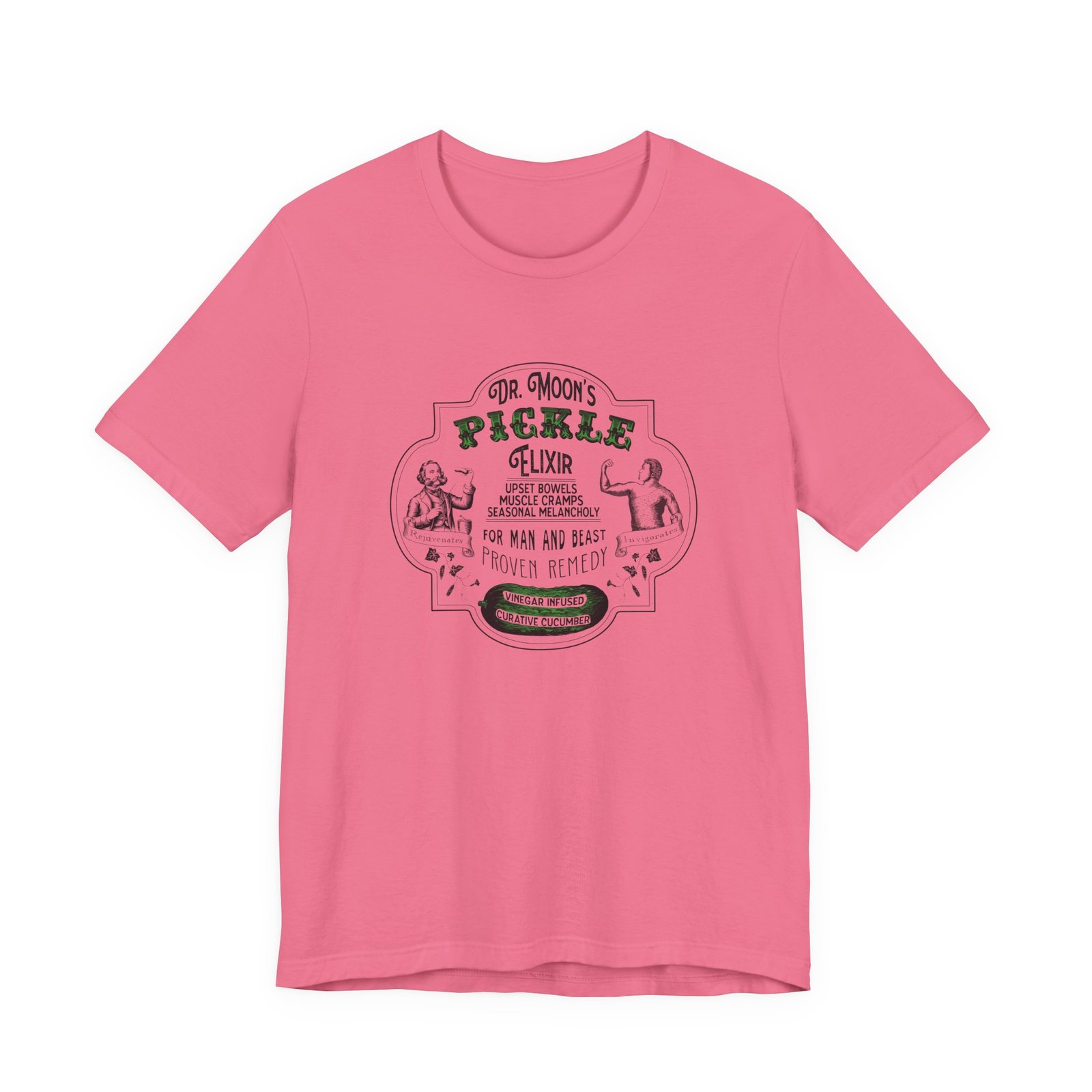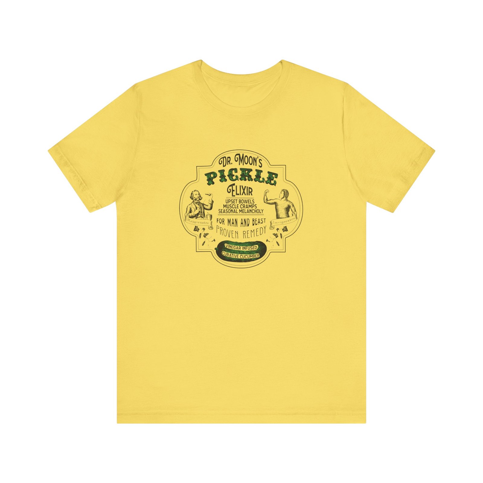 A shoutout to the snake oil peddlers of yesteryear. A funny pickle elixir shirt advertising the very real benefits of pickle juice to both beast and man!